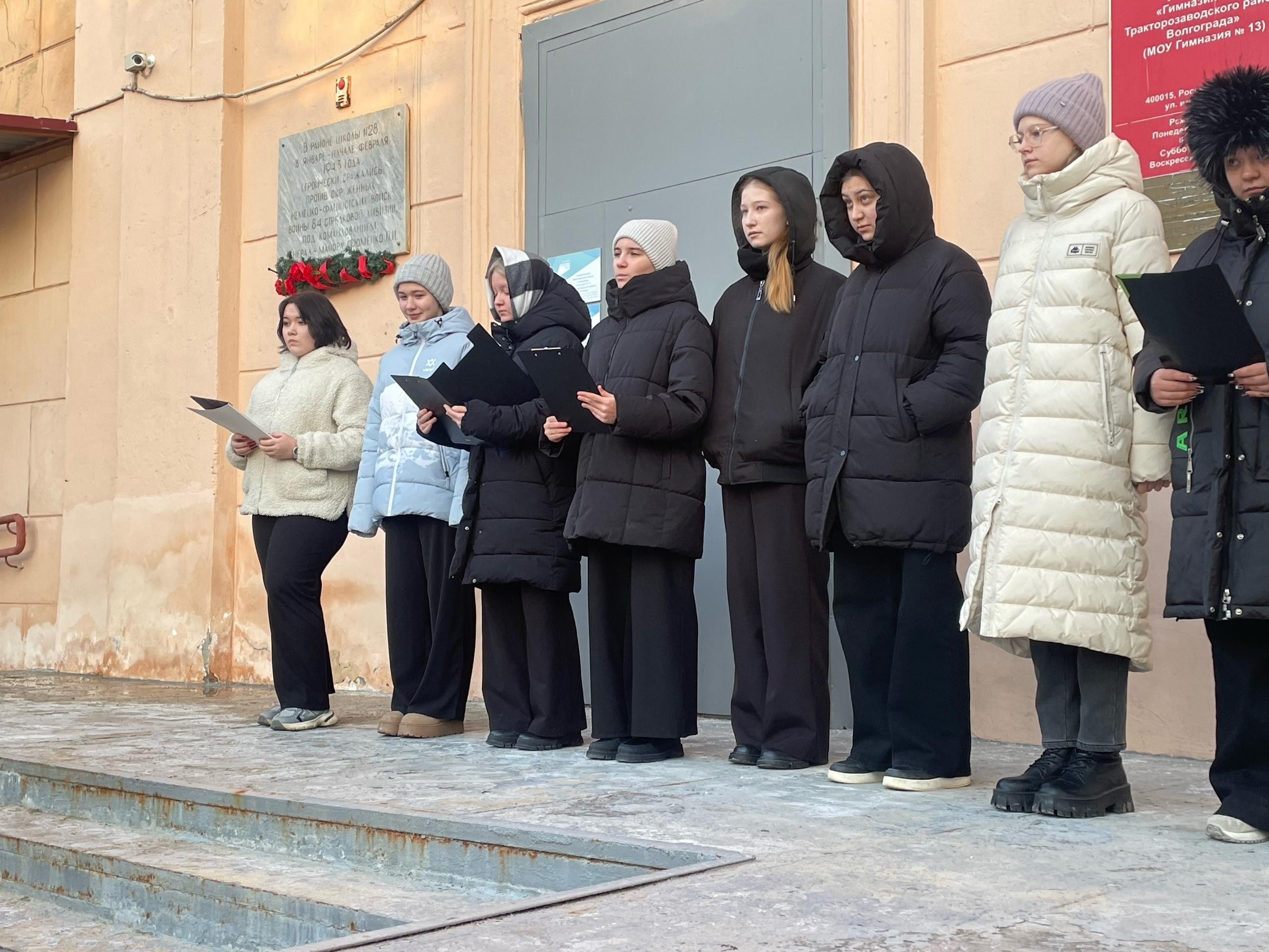 Митинг и возложение цветов к мемориальной доске, расположенной при входе в гимназию, где в январе - феврале 1943 года героически сражались против окруженных немецко - фашистских войск воины 84-й стрелковой дивизии под командованием генерал - майора Фоменко П.И.