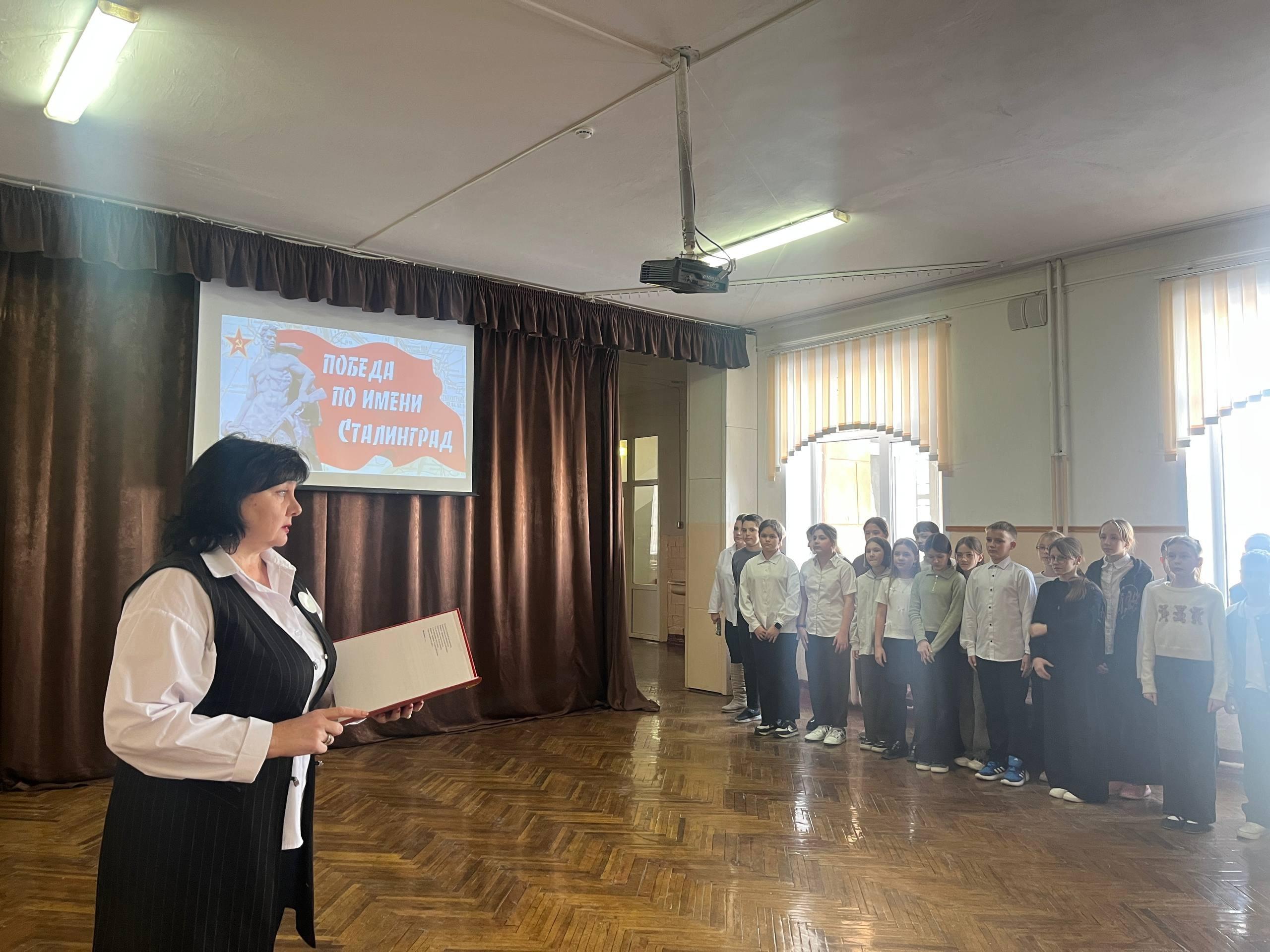 Торжественная линейка, посвященная 83-й годовщине победы советских войск над фашистскими захватчиками в Сталинградской битве, на которой с поздравлениями выступила директор гимназии Ольга Николаевна Бондарева.