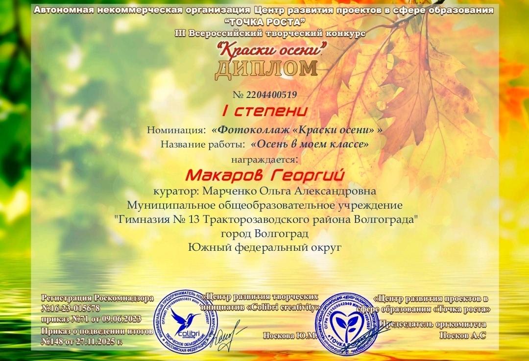 Учащийся 2- а класса Макаров Георгий награжден дипломом 1 степени в номинации фотоколлаж с работой "Осень в моем классе" Всероссийского конкурса "Краски осени".